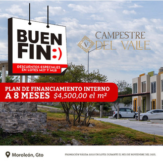 ¡Atención, Moroleón! Para nuestros inversionistas y familias que quieren construir su sueño, lanzamos dos planes de financiamiento interno con precios nunca vistos. ¡Solo en lotes de las manzanas MZ7 y MZ8 durante noviembre!